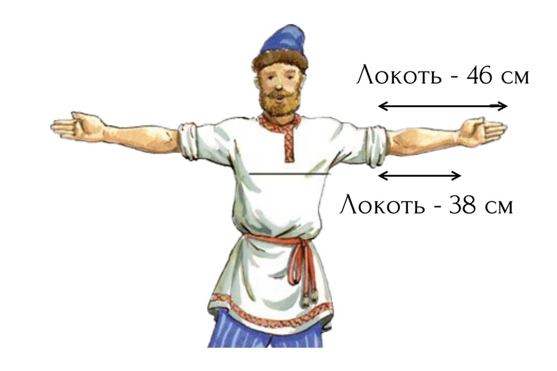 Наряду с аршином использовалась и другая естественная единица длины – локоть. Это расстояние от локтевого сгиба до кончика вытянутого среднего пальца или до сжатой в кулак кисти. И равнялся он соответственно 46 и 38 см.