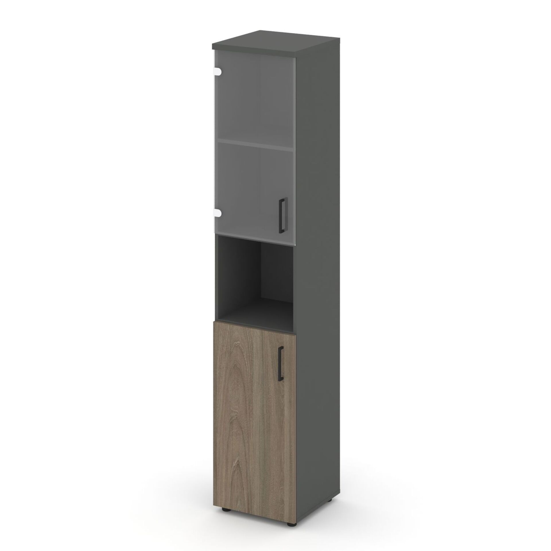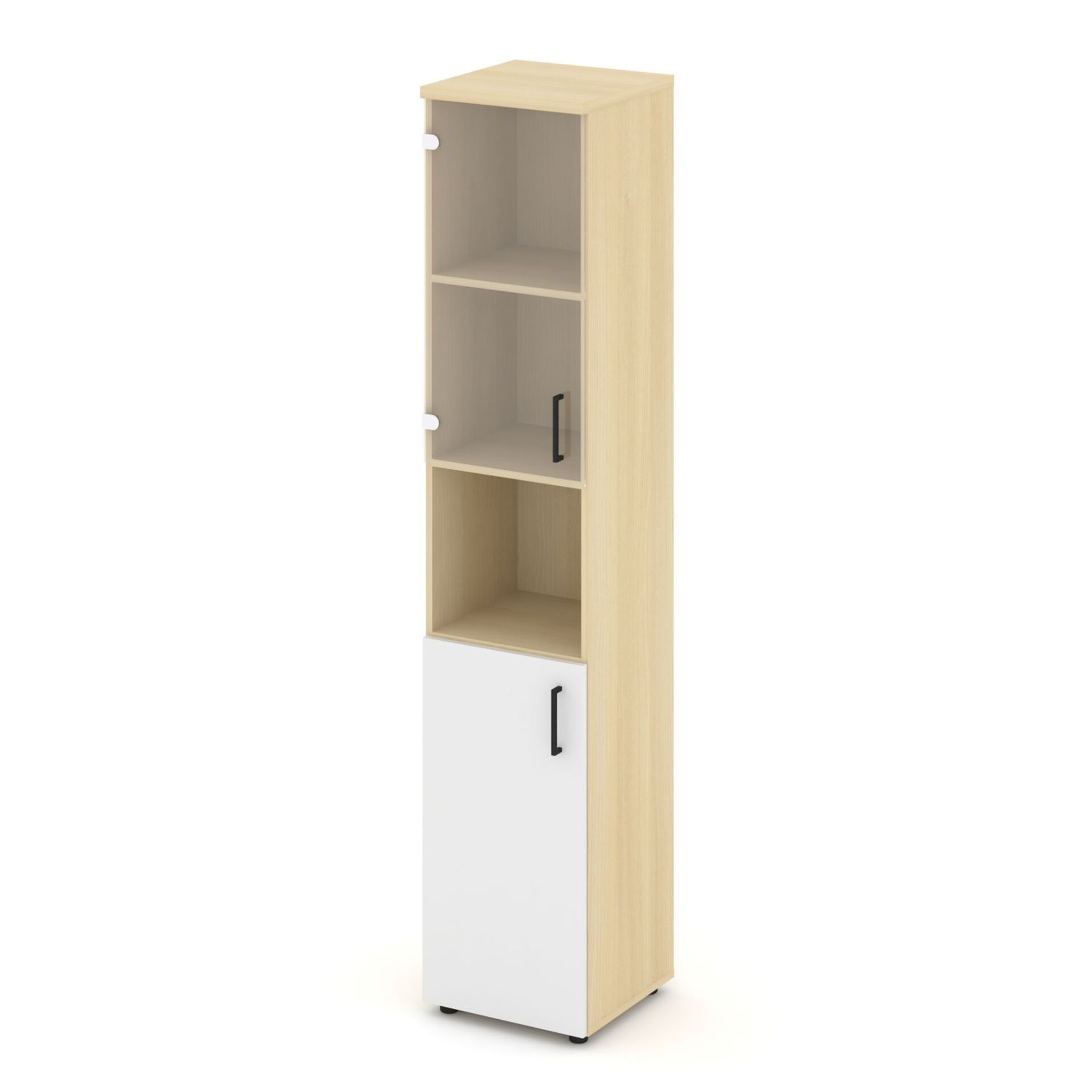 Шкаф высокий узкий левый (1 низкий фасад ЛДСП + 1 низкий фасад стекло прозрачное) SN.STU.E-105(L)